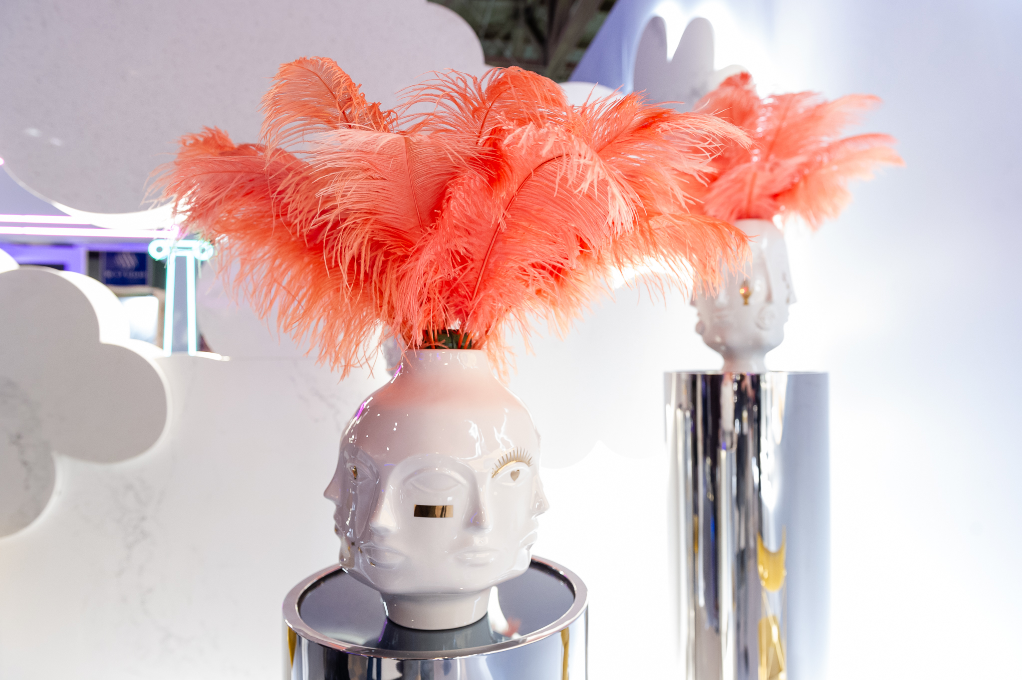 True to this year’s theme, the first installation attendees saw upon entry was Dreamland, a multi-sensory ethereal feature installation created by Jonathan Adler, and in partnership with Caesarstone. Attendees entered the fantastical environment that showcased quartz in a variety of colours, textures, and designs. There were cloud-shaped quartz coffee tables, white vases with faces and ostrich feathers, and neoclassical columns inspired by Caesarstone’s headquarters in Caesaria, Israel. The comfortable cloud-shaped sofas added to this frothy, Instagrammable, and stylish design.